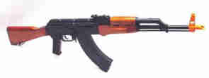Kalasnikov 47 This is an Airsoft AK-47 replica they are seen for sale for less than $100 often on ebay. The gun carries a clip of plastic BB's and fires them one at a time. There are also automatic Airsoft guns that fire BB's at a very fast rate, but they are very much more expensive on ebay. The orange tip at the end is to comply with ebay rules and new regulations on firearms replica. You can just paint it black. Enter the phrase AK-47 rifle in the ebay Search box at the right to search for guns like this to bid on at ebay. |
