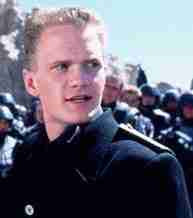Clancy Brown This is the man in charge of boot camp for the group of recruits that Johnny Rico trains with. The Sergeant is a man of absolute discipline. He dares anyone to see if they can best him in a one on one fight. No man stands forward but a female enlistee, Dizzy Flores steps forward. She does well at first but ultimately the Sergeant's experience beats her in physical combat. The Sergenat responds to a question about what good is a knife in a nuke fight by tossing a knife at the soldier that uttered the question. Without the hand to push a button a nuke is useless. Frequent trips to the medic are necessary for many of his trainees from time to time. |