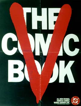 promotional poster made to promote the V comic book series that was being published by DC comics in 1985 and 1986. It is idential to promotional advertising that appeared in DC comics during the same period except it is larger than the one page adverstisement promotions which appeared in DC comics at the time. This is believed to not have been generally released for promotional purposes. If released as intended it would have been a fold out poster of 4 pages that would have been included in DC comic books to promote V. |