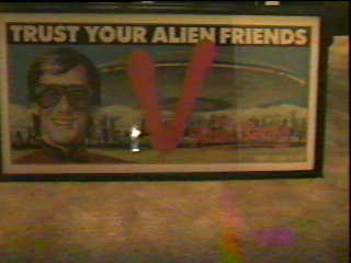 Poster was made to promote the second V mini series which was being aired on NBC. Image quality is not that good. The picture has a really bad glare. The poster says "Trust Your Alien Friends" Beneath that it says V the Final battle and gives dates it will be on. This is the only one of this style promotional poster I have ever seen. |