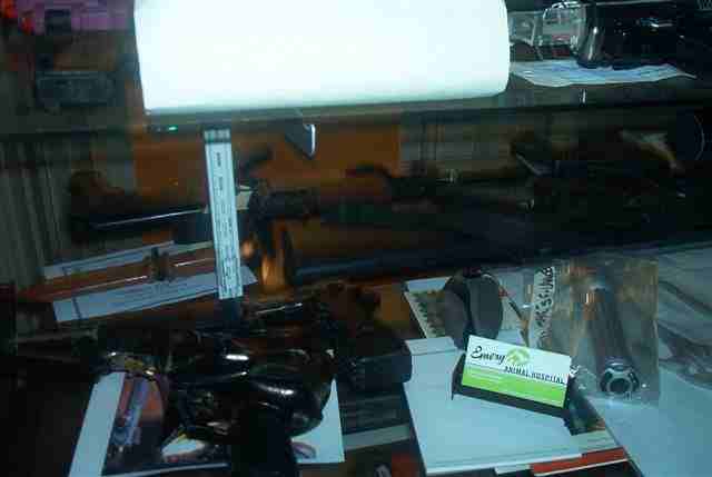 Below are pictures of a freestanding display case I have with glass shelves on two sides. I got it from a store going out of business. They accidentally gave me extra shelves so I mounted those on the wall for my Cleo weapons. In the first overall shot you can see a rifle from Masters of the Universe, some clubs from Xena, an Ak-47 from Red Dawn, and a big Chig rifle setting on the floor from Space Above and Beyond among other items. |
