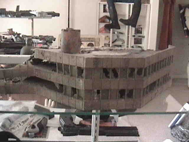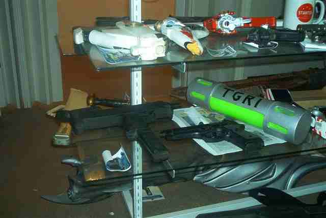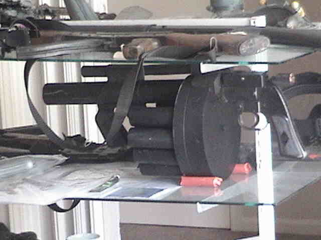 The big launcher type gun is from Terminator 2. It was a tear gas launcher used by Arnold. Its made from a modified flare gun. The movie also used a working tear gas launcher, and a rubber stunt version. I used penny rolls to keep it in position as it tends to want to roll. |
