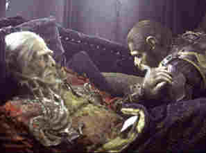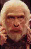 Thade's father is the former king of sorts for the Ape World. In a state of dire sickness his son, Thade has basically taken his place of power among his people. Before death the creature confides in his son Thade about the truth of Ape history. Humans used to be the masters and Apes used to be their inferiors. By showing his son a gun man invented centuries ago, Thade comes to see the true threat that man may pose to Apes. Damn them all to hell is the last wish that Thade's father departs on Thade in regards to humans. Interestingly enough Thade doesen't look anything like his father. While Thade is a chimpanzee, his father appears to be a relative of the flying furry doglike creature from the Never Ending story movies. |