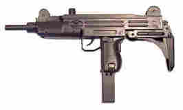 Uzi Submachine Gun This is an airsoft replica of an IMI Uzi 9mm Submachine gun. It includes a folding stock, removeable clip and the capacity to fire BB's one at a time. This gun is often seen on ebay for less than $50. This type of gun is similar to the type utilized towards the end of Red Dawn by the Russian that shoots at Jed and his brother. Enter the phrase Uzi in the ebay Search box at the right to search for guns like this to bid on at ebay. |