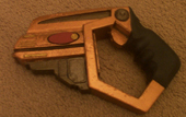 This is a backup rubber stunt Bajoran phaser as would have been used on Star Trek Deep Space Nine if needed. It was originally acquired in an unpainted state and then painted up before I received it.
