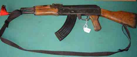 This AK-47 was used in an unknown movie production. The gun is made of rubber built around a metal support rod. Tip of the rifle barrel is painted red to avoid being confused with a real gun. It can be easily painted black again. Gun is molded off an original Norinco Mak-90 AK-47 from China. Since the original gun this was molded from was made in 1990 at the earliest this gun woudl have had to have been used in movies made in 1990 or after.